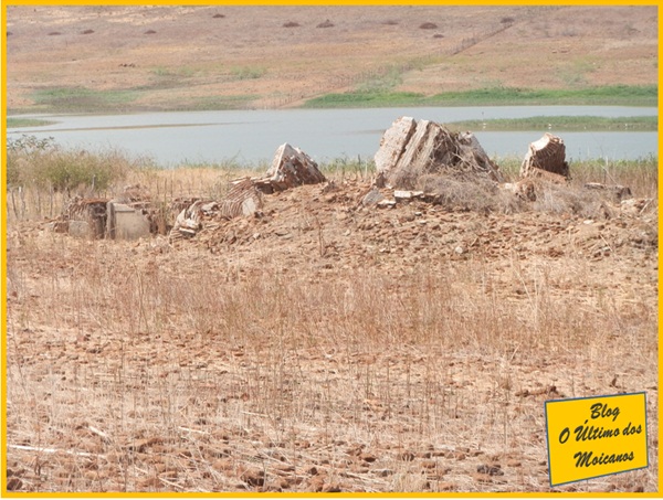 Esta visão é só possível pela seca que fez o reservatórimo do açude a descer o mais baixo níveis. Normalmente esta área é coberta d'água. Estes tijolos eram das casas da primitiva cidade, à época Jatobá de Piranhas.